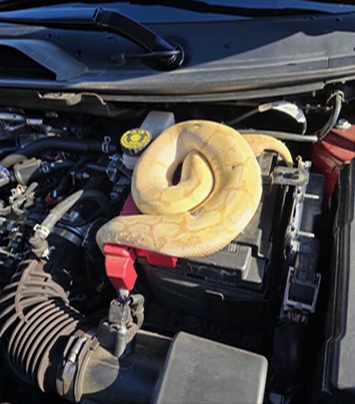 보닛을 열자마자 노란색 비단뱀이 엔진룸 배터리 위에 똬리를 틀고 있었던 것이다. 해당 광경을 본 남성은 "눈 앞의 광경을 도저히 믿을 수 없었다"고 말했다.