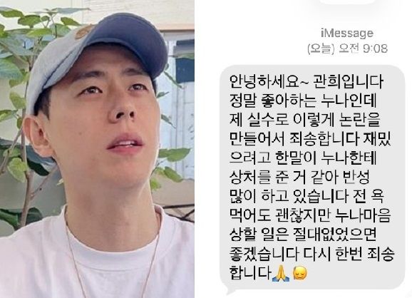 [파이낸셜뉴스] 방송인 홍진경이 자신을 향한 농구선수 이관희(서울 삼성 썬더스)의 무례 발언과 관련 사과 받았다고 밝혔다. 홍진경은 지난달 31일 자신의 SNS를 통해 ‘솔로지옥’ ‘사과지옥’이라며 이관희와 나눈 문자 메시지를 공개했다. 공개된 문자에서 이관희는 "정말 좋아하는 누나인데 제 실수로 논란이 생겨 죄송하다. 재미있자고 던진 말이 상처가 됐을 것 같아 많이 반성하고 있다"며 "저는 욕을 먹어도 되지만 누나 마음만은 다치지 않았으면 좋겠다"고 사과를 전했다. 이에 홍진경은 "어제도 전화하고 오늘 또 문자까지 이제 사과는 그만해도 돼"라며 "방송하다 보면 누구나 말실수 할 수 있다. 괜찮다. 다음엔 농구나 가르쳐줘"라고 답했다. 앞서 이관희는 자신의 유튜브 채널 ‘농구선수갓관희’에 ‘솔로지옥’ 시즌3에 함께 출연한 배우 윤하빈과 ‘솔로지옥’ 시즌5를 시청하며 이야기를 나누는 영상을 공개했다. 영상에서 이관희는 “이 얘기를 하고 싶었는데 진경 누나도 연애 잘 모를 것 같다“며 “연애 훈수를 두는 게 화가 난다”고 말했다. 윤하빈이 “(홍진경은) 결혼도 하고 아이도 있는 거 아니냐”고 하자 이관희는 “결혼하면 나보다 나은 거냐”며 “나도 결혼할 건데”라고 했다. 또 이관희는 "(다른 패널) 한해·덱스·이다희는 인정하는데, 홍진경은 이해를 잘 못하겠다"며 "솔직히 나보다 연애를 잘 할 거라 생각하지 않는다. 나랑 안 맞는 것 같다"고 했다. 이에 윤하빈이 "저는 (홍진경을) 존중한다. 자기만의 스타일이 있는 거 아닌가"라며 옹호하는 입장을 보였다. 반면 이관희는 "진경 누나, 잘 좀 해라. 재미없다"고 말하며 웃음을 보였다. 영상 공개 직후 누리꾼들 사이에서는 이관희의 언행이 무례하다는 지적이 제기됐다. 파문이 확산되자 현재 해당 영상은 비공개로 전환된 상태다. 누리꾼들은 “홍진경에게 무례하다”, "외모로 무시하는거냐", "예의와 눈치도 지능의 영역", "언제부터인가 사람들이 무례함과 소신 발언의 차이를 모르기 시작했다", "팩폭이 아니라 무례한 것" "나이에 맞는 언행을 하길" 등 비판 의견을 냈다. moon@fnnews.com 문영진 기자