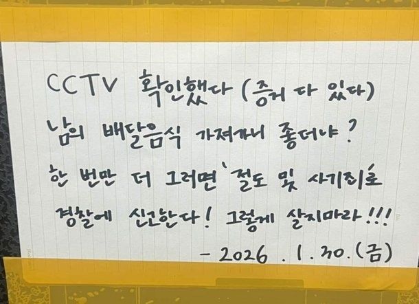 [파이낸셜뉴스] 배달 완료 인증 사진을 촬영한 뒤 음식을 배달하지 않고 사라진 기사가 논란이 되고 있다. 비대면 배달 시스템의 허점을 악용한 이른바 '배달 먹튀' 사례다. 5일 한 온라인 커뮤니티에는 '배달 완료 사진만 찍고 음식 훔쳐 간 배달 기사'란 제목의 글이 올라왔다. 작성자 A씨는 경남 김해시 구산동의 한 아파트에서 배달 기사가 음식을 문 앞에 두지 않고 인증 사진만 촬영한 뒤 다시 챙겨갔다고 토로했다. 그는 아파트 폐쇄회로(CC)TV를 통해 기사가 현관 앞에서 사진을 찍은 뒤 음식을 들고 이동하는 장면을 확인했다고 덧붙였다. 이후 A씨는 아파트 게시판에 경고문을 부착했다. 해당 경고문에는 "CCTV 확인했다. 증거 다 있다. 한 번만 더 그러면 절도 및 사기죄로 경찰에 신고하겠다"는 내용이 담겼다. 사연을 접한 누리꾼들은 "경고할 게 아니라 즉시 신고해야 한다", "재발 방지를 위해 강력한 조치가 필요하다" 등의 반응을 보였다. hsg@fnnews.com 한승곤 기자