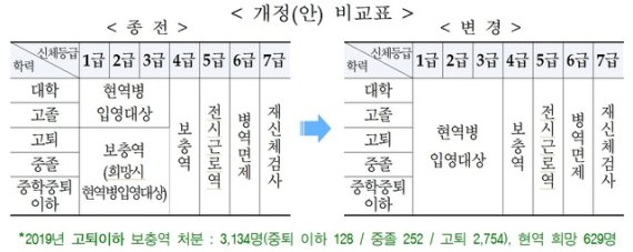 병무청 관계자는 "병역판정검사에서 학력에 관계없이 신체등급에 의해서 병역처분함으로써 그동안 발생한 학력에 따른 병역이행 형평성 문제를 해소할 수 있을 것"이라고 말했다.