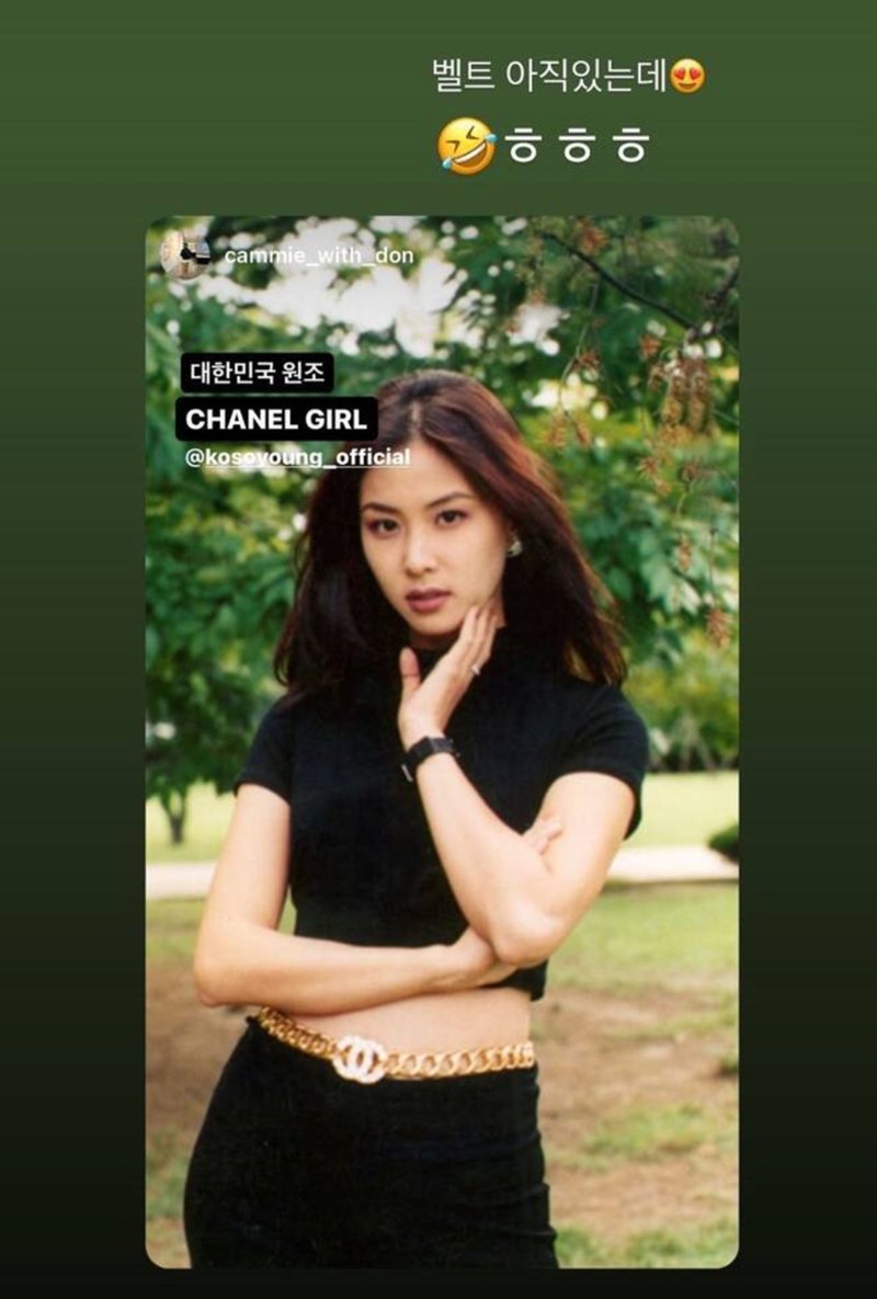 고소영은 3일 자신의 소셜미디어에 과거 화보 사진을 올렸다. 고소영은 '대한민국 원조'라고 남긴 사진을 태그하며 과거 리즈 시절을 밝혔다. 사진 속 고소영은 앳된 외모에 청순한 매력을 뽐내고 있다. 크롭티를 비롯한 올 블랙 패션에 명품 C사 체인 벨트를 매치해 눈길을 끌었다. 사진에는 "대한민국 원조 샤넬 걸"이라는 문구가 적혀있었고, 이를 본 고소영은 "벨트 아직 있는데"라며 하트눈과 웃음 이모티콘을 썼다.