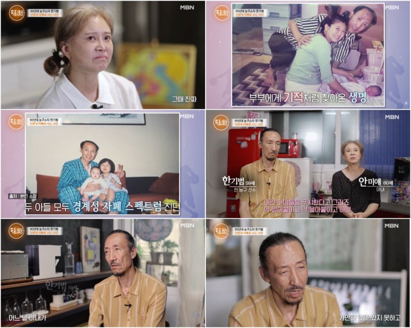 한기범은 경계성 자폐 스펙트럼을 진단받은 두 아들의 이야기도 전했다. 한기범의 아내 안미애 씨는 "난임이었기에 병원을 오래 다녔다. 남편은 '나는 아기 없어도 당신만 있으면 된다'고 말해줬다"고 털어놨다. "이후 아기를 낳고 유모차에 태워 외출했는데 자기 혼자 '나도 이런 날이 있었구나'라고 하더라. 그 말을 듣고 찡했다. 안 낳았으면 어쩔 뻔했나 싶었다. 너무 행복했다"며 눈물을 보였다. 그러면서 "이 사람하고 잘 살아야지 그런 생각이 들었다"고 덧붙였다.