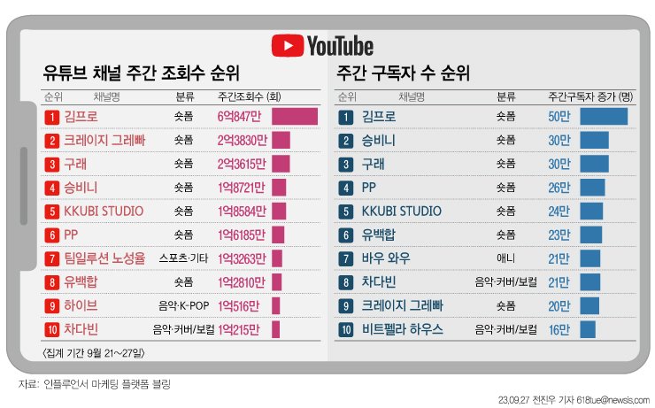 주간 구독자수 2~10위는 ▲승비니(30만명↑) ▲구래(30만명↑) ▲PP(26만명↑) ▲꾸비 스튜디오(24만명↑) ▲유백합(23만명↑) ▲바우와우(21만명↑) ▲차다빈(21만명↑) ▲크레이지 그레빠(20만명↑) ▲비트펠라하우스(16만명↑)으로 집계됐다.