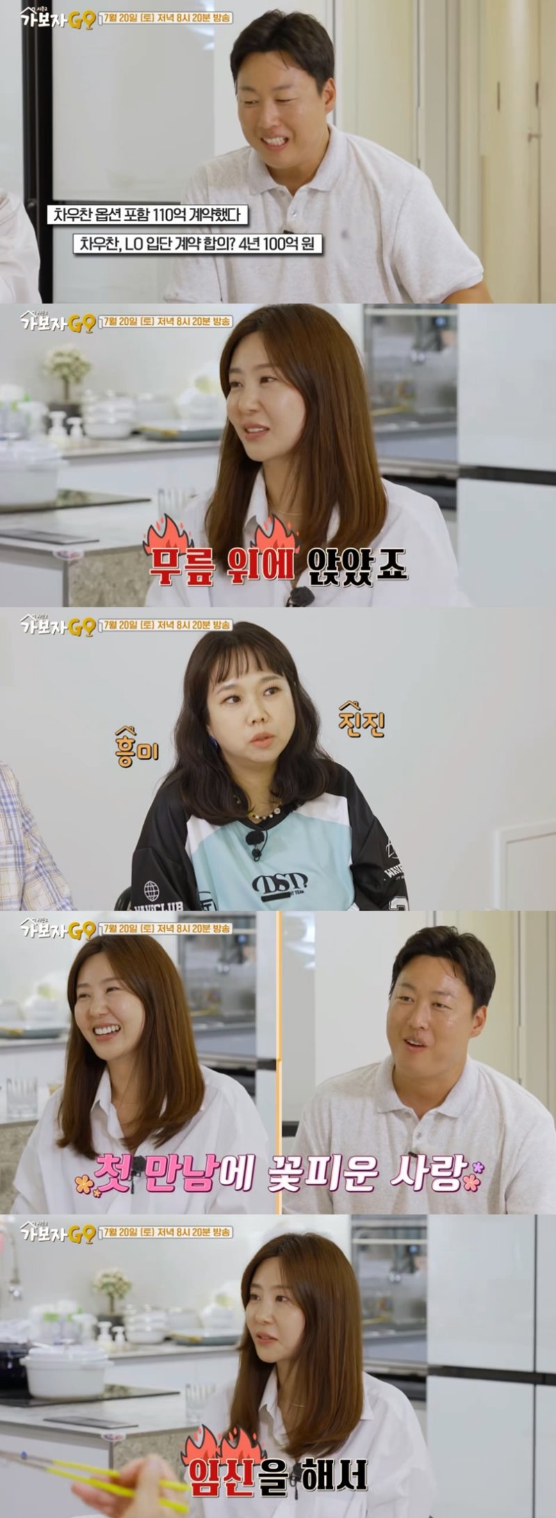 차우찬 부부와 식사하던 MC 안정환과 홍현희는 두 사람의 첫 만남에 대해 질문했다. 친한 형과의 약속 장소에서 처음 만났다고 밝힌 차우찬은 그날의 기억을 떠올리며 수줍은 미소를 지었다.