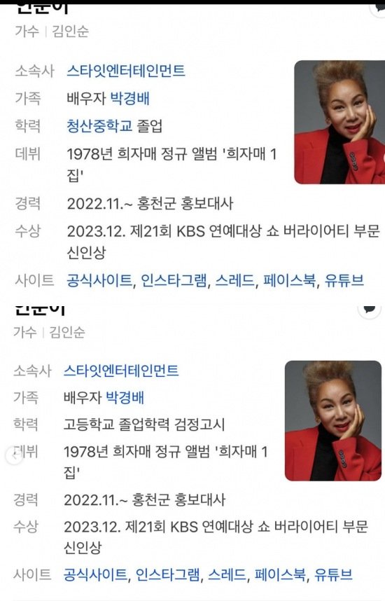 사진에는 포털사이트에 게재된 인순이 프로필이 담겼다. 학력이 청산중학교 졸업에서 고등학교 졸업 학력 검정고시로 바뀌었다. 인순이는 최근 고등학교 졸업 학력 검정고시에 응시해 합격한 것으로 알려졌다.