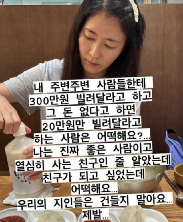 김미려는 최근 자신의 소셜미디어에 "내 주변 사람들한테 300만원 빌려달라고 하고, 그 돈 없다고 하면 20만원만 빌려달라고 하는 사람은 어떡해요?"라고 글을 올렸다.