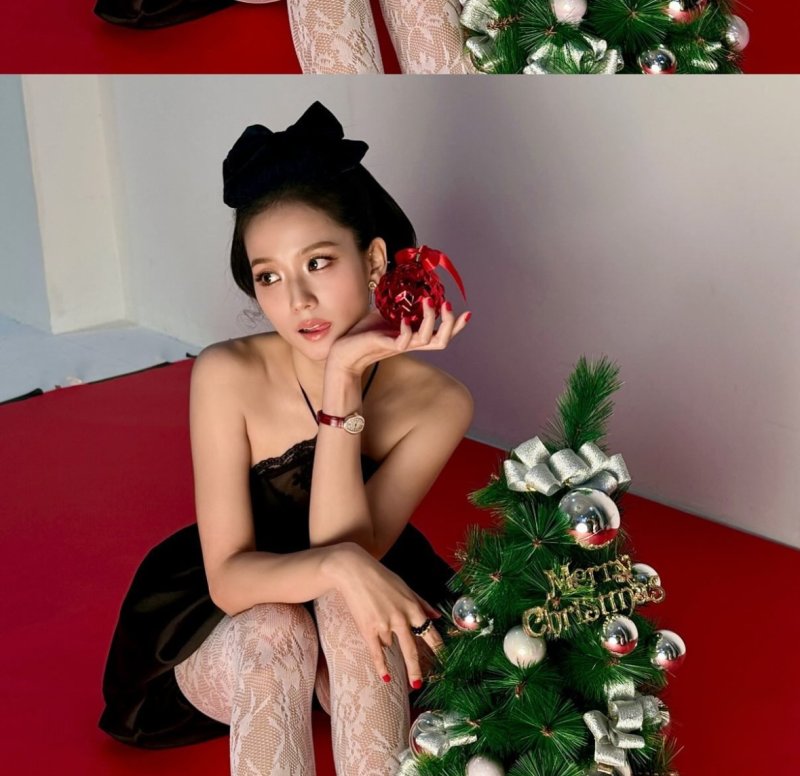 공개된 사진 속 지수는 크리스마스트리 옆에서 검은색 미니 드레스를 입고 포즈를 취했다.