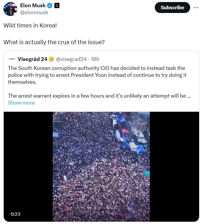 그가 공유한 비세그라드24의 게시물에는 한국의 고위공직자범죄수사처(공수처)가 경찰에 윤석열 대통령에 대한 체포영장 집행을 이관하기로 했으며, 윤 대통령에 대한 지지율이 높아지고 있다는 내용이 담겼다. 또 비세그라드24는 글과 함께 공개한 영상이 윤 대통령 지지자들의 집회 현장을 보여준다고 알렸다.