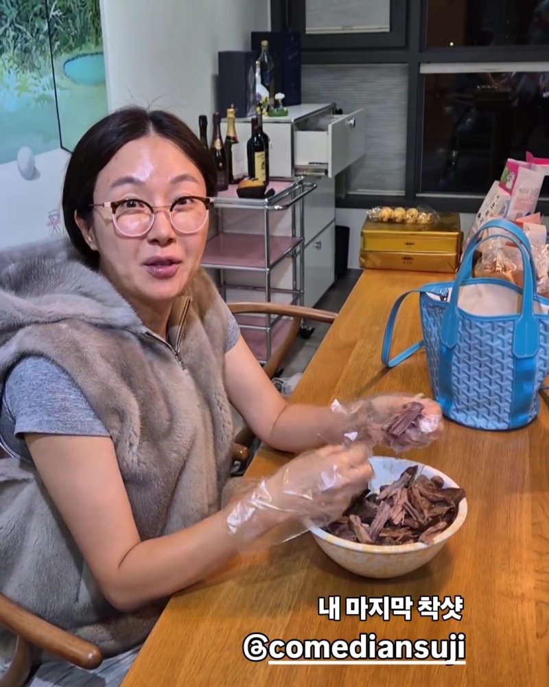 김지혜는 25일 인스타그램에 "잘가…내 마지막 착샷"이라며 이수지를 태그했다. 밍크 조끼를 입은 채 장조림을 준비하고 있다. 식탁 위 고야드 가방도 시선을 끌었다.