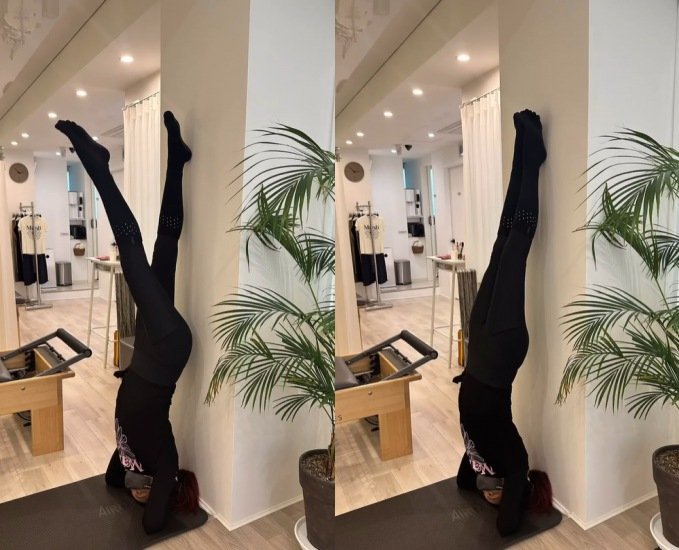 김희선은 8일 소셜미디어에 물구나무 자세를 한 자신의 모습을 공개했다.