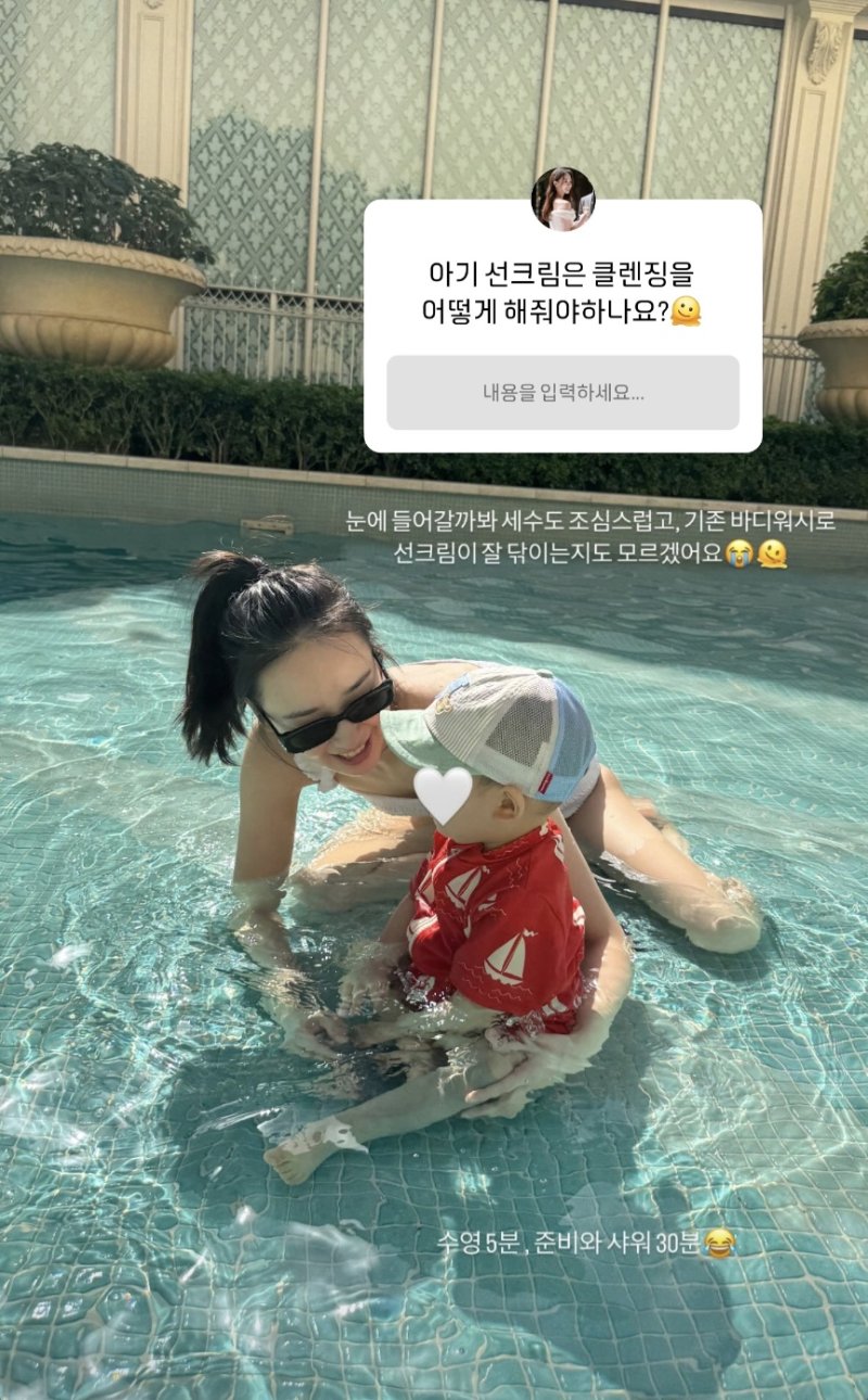 한 누리꾼이 보내온 질문도 덧붙였다. "아기 선크림은 클렌징을 어떻게 해줘야 하나요"라고 묻자 손연재는 "눈에 들어갈까봐 세수도 조심스럽다. 기존 바디워시로 선크림이랑 잘 닦이는지도 모르겠다"고 답했다.