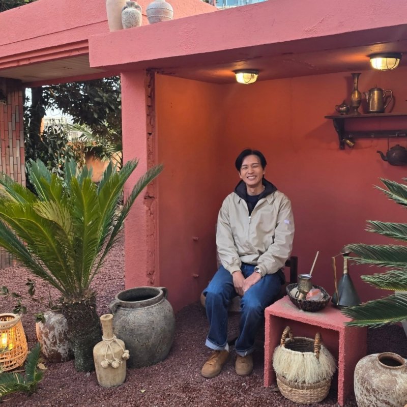 사진 속 구본승은 빨간 배경의 카페 포토존으로 보이는 곳에 앉아 해맑게 눗웃음을 짓고 있다.