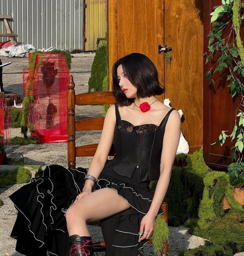 검은 단발머리와 빨간 장미 목걸이가 이목을 끈다.