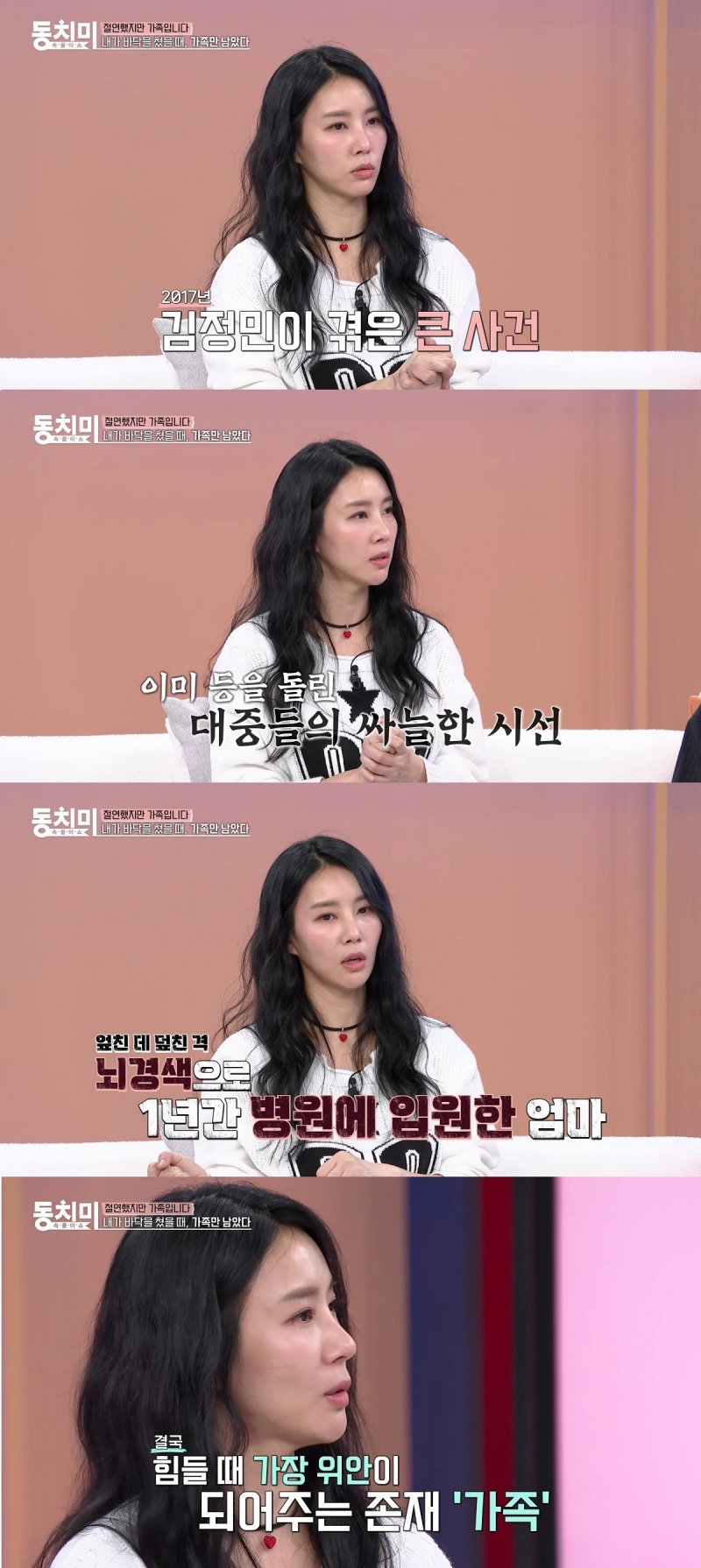 김정민은 "그때 엄마도 뇌경색으로 쓰러지셔서 1년간 병원에 입원해 계셨다"며 "아픈 엄마를 제가 챙길 수도 없고, 힘든 딸을 엄마도 챙길 수 없는 상황이었다. 불행 앞에 서로를 챙기지 못했지만, 말은 안 해도 서로의 마음을 알 수 있었다"고 했다.