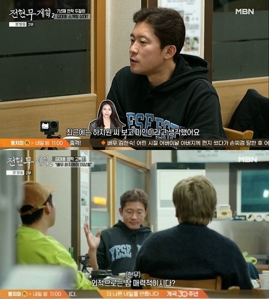김대호는 18일 방송한 MBN '전현무계획2'에서 "외모적으로 매력적이라고 느낀 분은 없느냐"는 질문에 "최근 하지원씨를 보고 미인이라고 생각했다"며 "함께 여행 방송을 했고, (사적으로도) 연락하고 있다. 이런 얘기를 하는 건, 당연히 친하기도 하고 오해없이 받아들일 테니까"라고 설명했다.