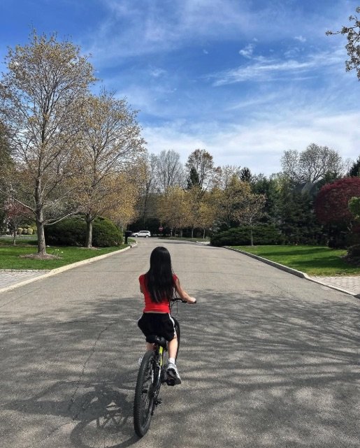 이 사진에는 자전거를 타고 있는 딸 리호의 뒷 모습이 담겼다. 긴 머리를 한 리호는 긴 팔다리로 자전거를 타고 있는 모습이다.