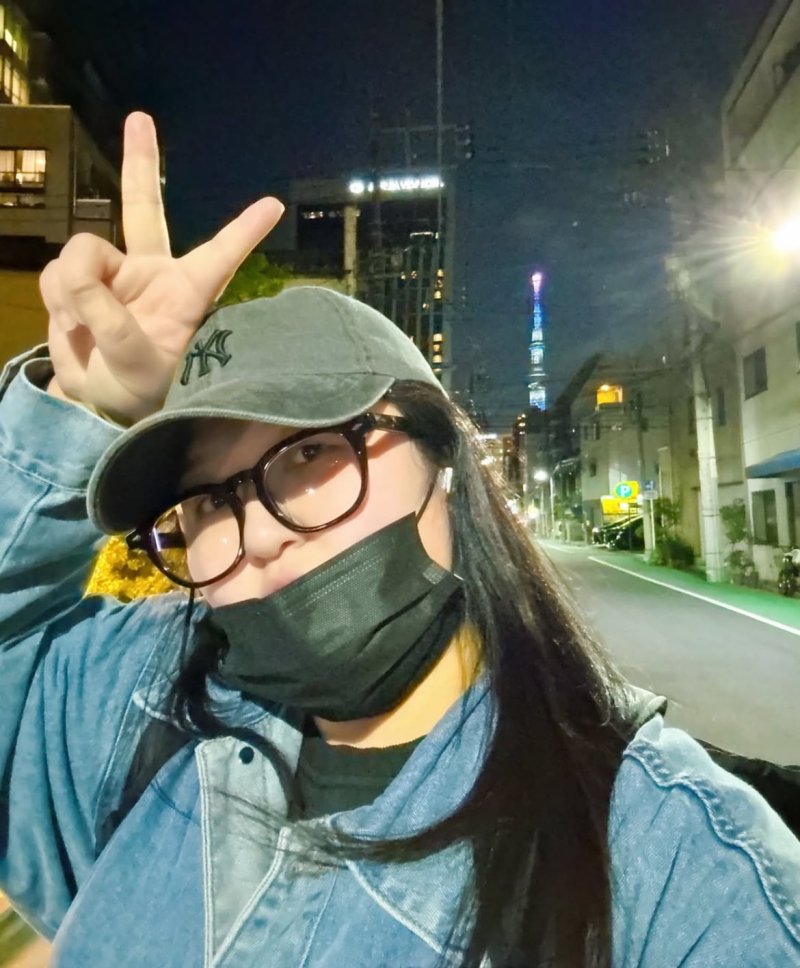 사진 속에는 이국주가 도쿄 거리에서 브이(V) 포즈를 하고 있다.