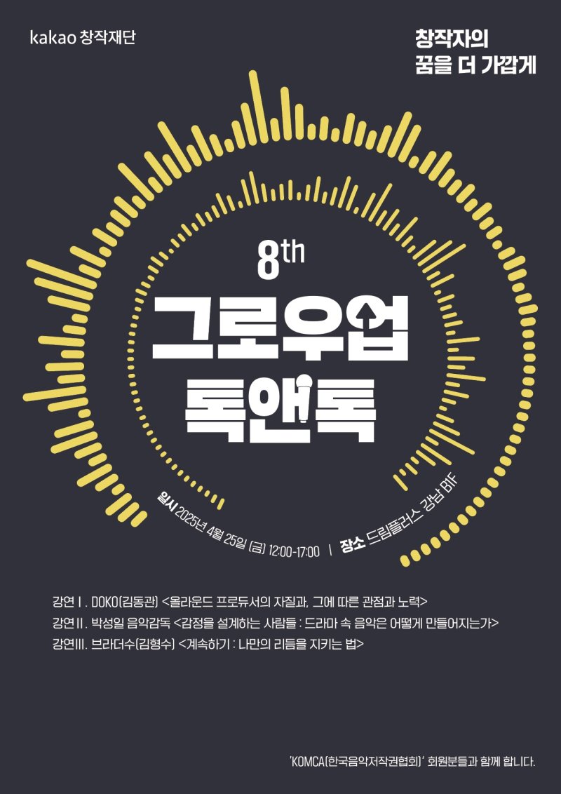 카카오엔터테인먼트(공동대표 권기수 장윤중)와 카카오창작재단은 오는 25일 오후 12시부터 오후 5시까지 서울 강남 드림플러스에서 음악 분야 예비 창작자를 위한 강연 프로그램 '제8회 그로우업 톡앤톡'을 연다.