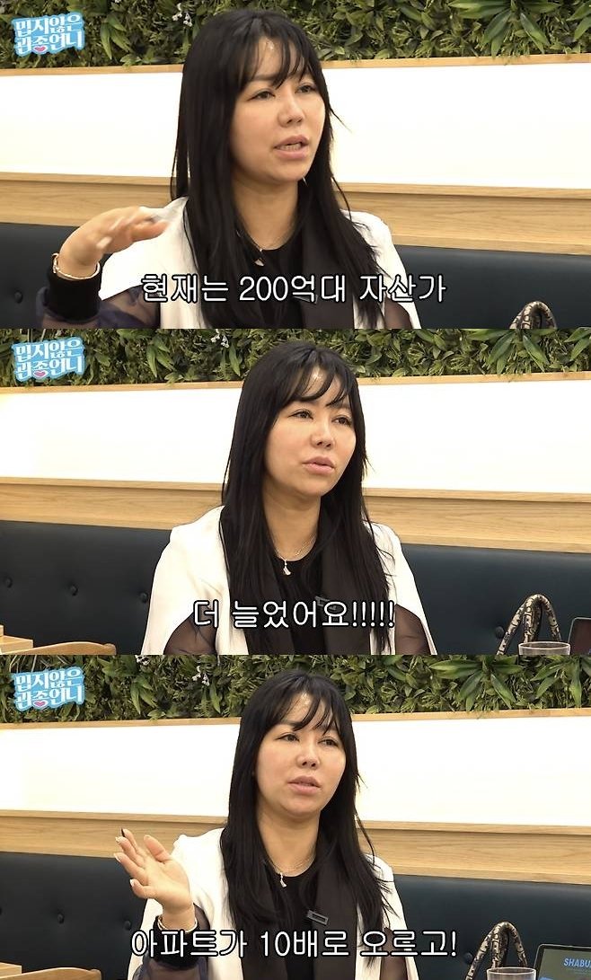 정숙은 24일 유튜브 채널 '밉지않은 관종언니'에서 "50억대 자산가로 알고 있다. 더 벌어서 80억원대 부자가 됐느냐"는 지질문을 받았다. "(자산이) 더 늘었다. 젊었을 때 안 해본 일이 없다. 신문 배달, 구두 닦기, 고깃집 불판 닦기, 대리운전까지 했다. 그 돈을 모아 아파트를 샀는데 10배로 올랐다. 부동산이 대박 나서 다른 곳에 투자했는데, 또 대박이 나서 100억원, 200억원이 됐다"고 설명했다.