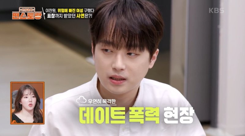 이찬원은 야간 자율학습 후, 친구를 만나러 가던 길 한 취객한테 폭행을 당하는 여성을 목격했다며 "지금으로 따지면 데이트 폭력이었다"고 당시 상황을 설명했다.