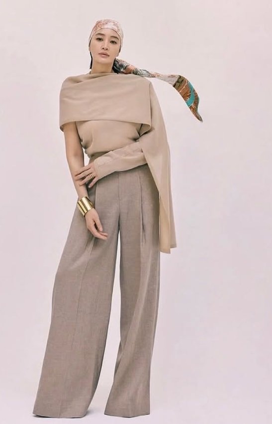 화보 속 김혜수는 베이지 톤의 의상과 헤드 스카프를 소화했다.