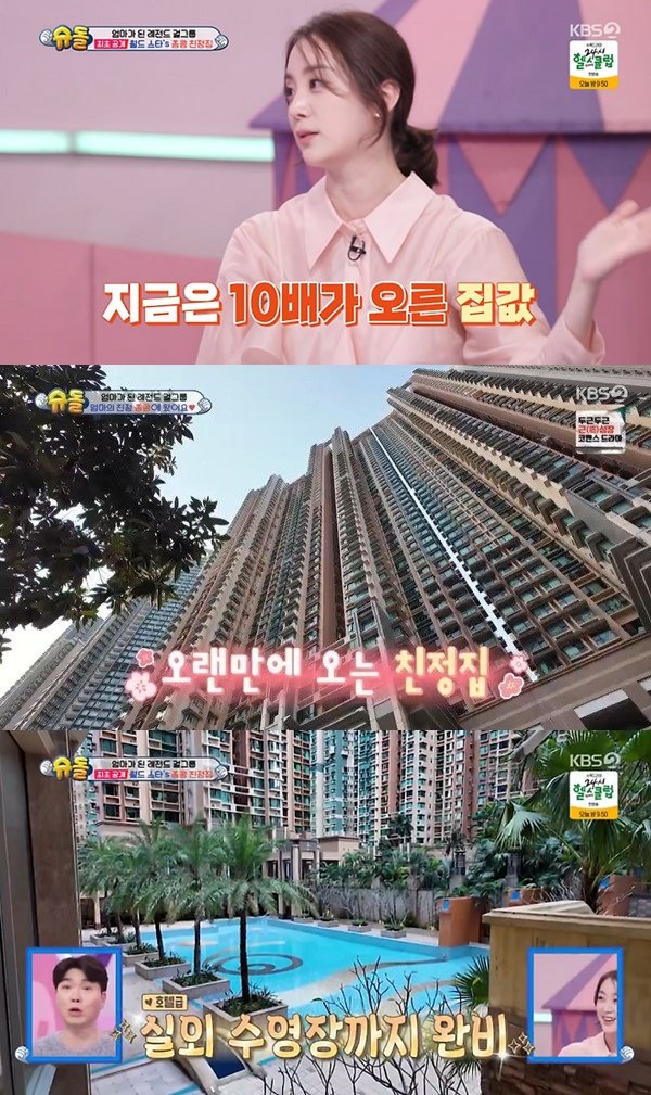 혜림 친정집은 고급 아파트로 실내 놀이터, 체육관, 헬스장, 테니스장, 수영장 등을 갖췄다. MC 박수홍이 "금수저였네"라며 놀라자, 혜림은 "부모님이 IMF 때 집값이 떨어졌을 때 운 좋게 샀다. 지금 10배가 올랐다"고 귀띔했다. 개그우먼 안영미는 "나는 이런 얘기를 들으면 배가 아프다. 나도 홍콩 가고 싶다"고 너스레를 떨었다.
