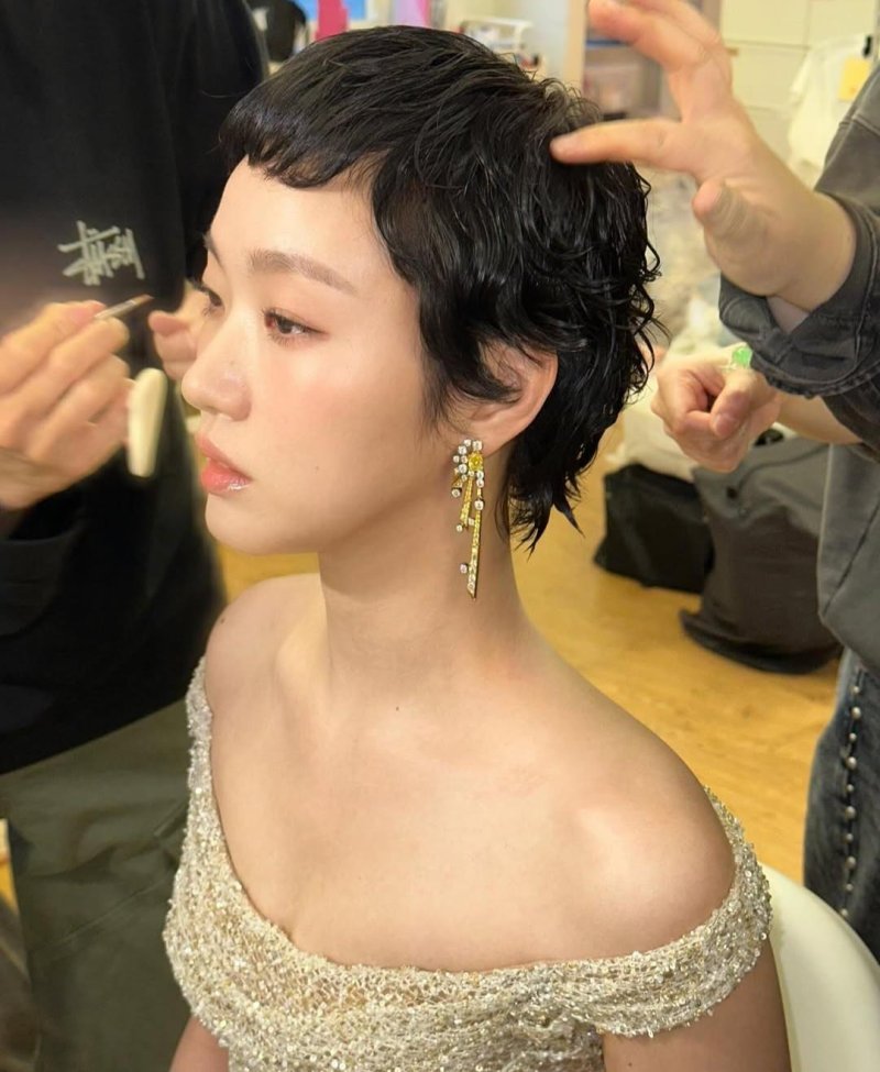 김고은은 숏컷 헤어에 오프숄더 시스루 드레스를 입고 청순한 매력을 발산했다.