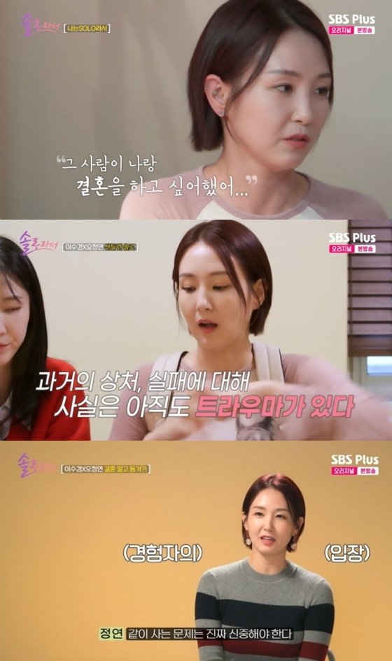 오정연은 13일 방송한 SBS플러스 '솔로라서'에서 "30대 중반 사춘기가 확 왔을 때 우울한 시기를 보낸 후 만난 사람이 있다. 매일 만나고 내 주변인, 가족들과도 친하게 지냈다. 직장인이었는데도 내가 원하면 언제든지 만났다"며 "연애한 지 2년이 다 되어가던 때 그 사람이 나랑 결혼하고 싶어했다. 난 일을 더 하고 싶어서 결혼 시기 이견이 안 좁혀졌다. 내 선택에 후회는 없다. 결혼하지 않고 한 일들에서 오는 즐거움도 컸다"고 털어놨다.