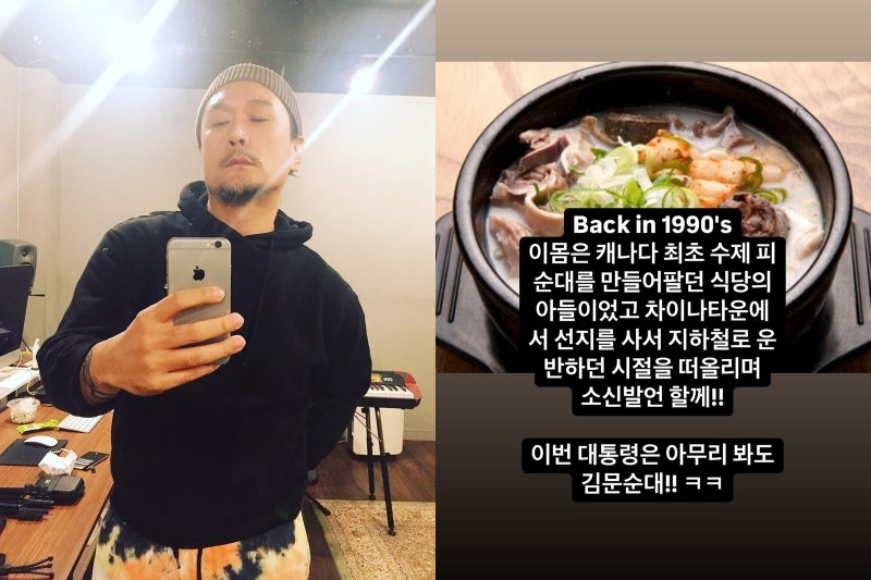 14일 JK 김동욱은 인스타그램에 "백 인(Back in) 1990's 이 몸은 캐나다 최초 수제 피순대를 만들어 팔던 식당의 아들이었고 차이나타운에서 선지를 사서 지하철로 운반하던 시절을 떠올리며 소신발언 할게"라며 글을 썼다.