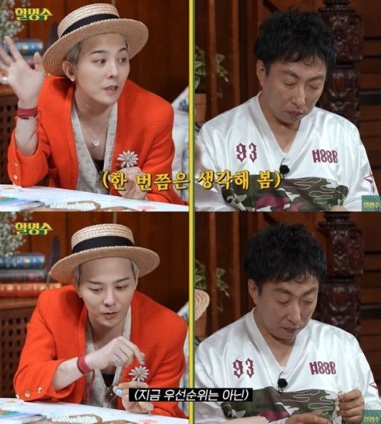 지드래곤은 14일 코미디언 박명수 유튜브 채널에 나와 결혼 관련 질문을 받고 "당연히 결혼에 대한 생각이 있다"고 했다. 다만 "아직 결혼에 대해서 크게 (생각하지는 않는다)"라고 말했다.