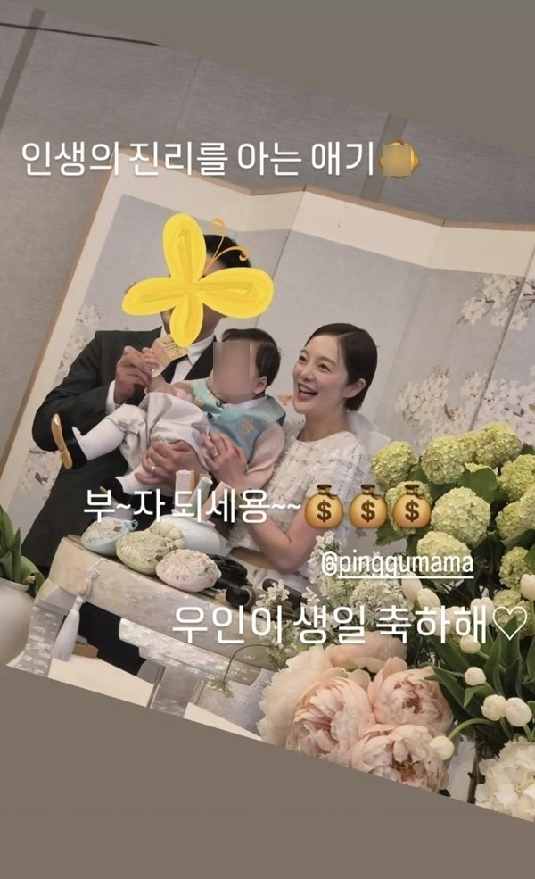 아들 우인 군은 돌잡이로 5만 원권 지폐를 잡은 모습이다.