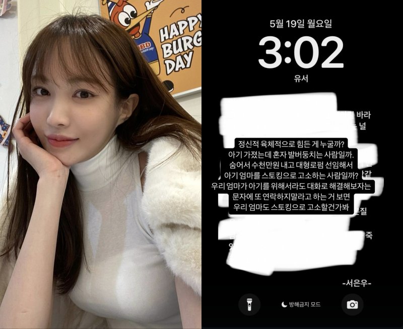 서은우는 "우리 엄마가 아기를 위해서라도 대화로 해결해 보자는 문자에 또 연락하지 말라고 하는 거 보면 우리 엄마도 스토킹으로 고소할 건가봐"라고 밝혔다.