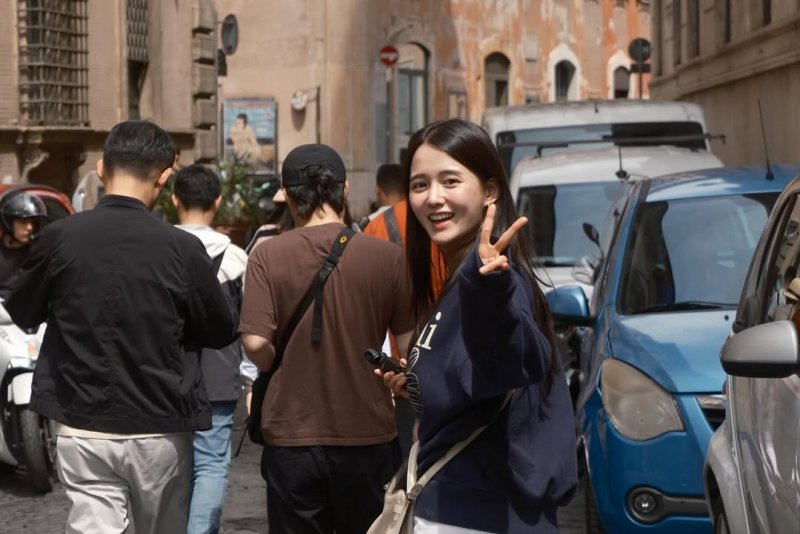 남보라는 이탈리아 관광지에서 해맑게 브이(V) 포즈를 하고 있다.