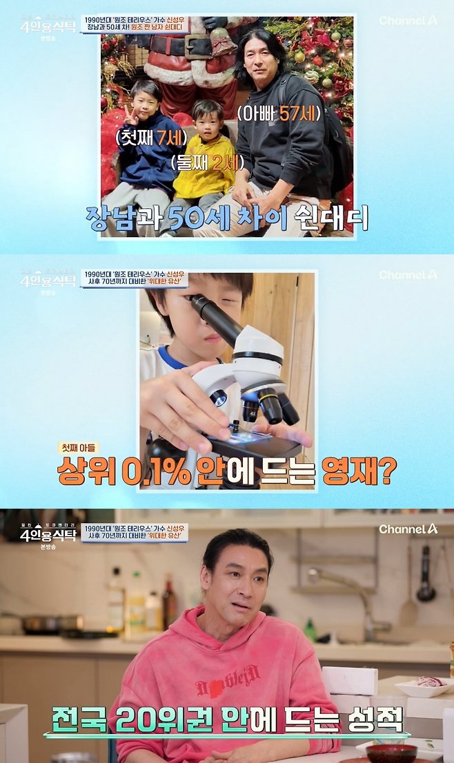 신성우는 19일 방송한 채널A '절친 토큐멘터리 - 4인용식탁'에서 첫째 아들 태오(7)와 쉰살 차이라며 "시험 성적이 상위 0.1%, 전국 20위 안에 든다. 시험을 잘 봤는데 나한테 '왜 얘기를 안 하지' 싶었다. 따로 불러서 무릎에 앉혀 놓고 '고맙다, 잘 했다, 자랑스럽다'고 얘기했다. 하버드 간다고 하면 내가 쏜다"고 밝혔다.