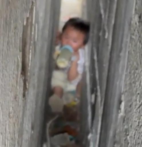 [뉴시스] 중국 구이저우성 톈런시에서 벽에 갇힌 아이가 울다 지쳐 우유를 먹고 있다. (사진=광명망) 2025.05.26