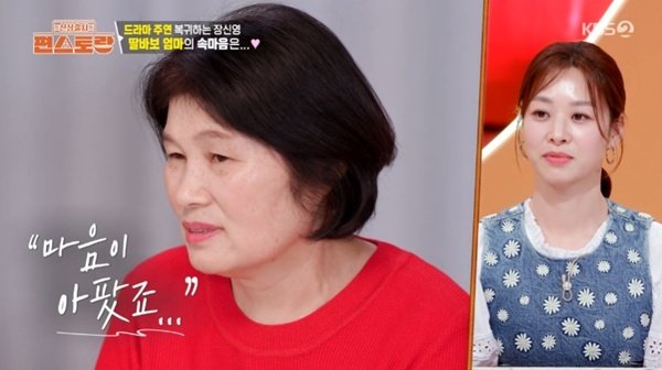 어머니는 곧 일일드라마 주연으로 3년 만에 안방극장 복귀를 앞둔 딸을 향한 속마음을 고백해 눈길을 끌었다. 장신영의 공백기를 걱정했던 어머니는 "조금 그런 시기가 있었잖아"라며 "나가서 일을 해야 하는 앤데, 집에서 거의 갇혀 살다시피 했다, 활기 있게 해야 하는데 못하니까 마음이 아팠다"라고 속상한 마음을 털어놨다.