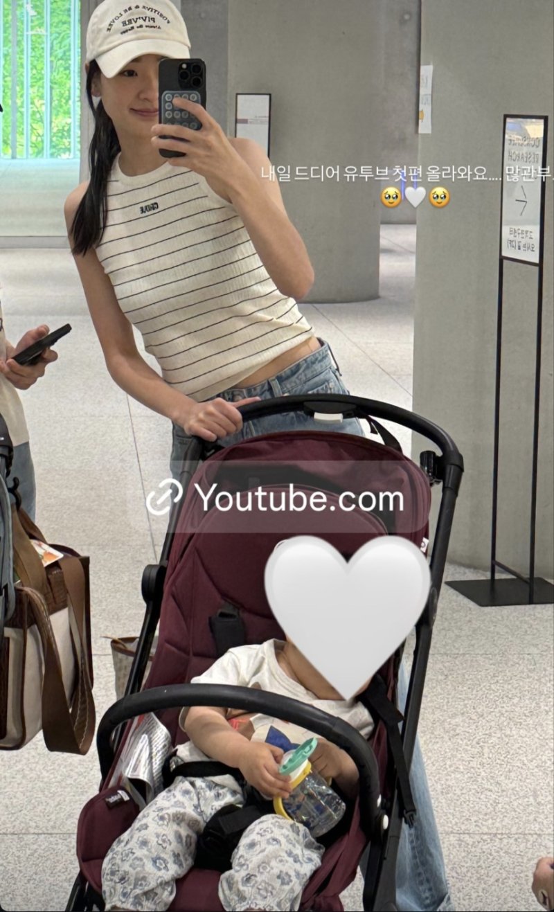 사진 속 손연재는 유모차를 탄 아들을 앞에 두고 셀카를 찍었다.