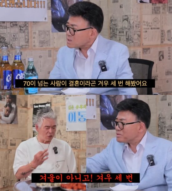 엄영수는 "사람들은 내가 맨날 결혼하고 이혼한 줄 안다. 내 나이가 70이 넘었는데 겨우 세 번 결혼했다"고 답했다. 이어 "앞에 '겨우'를 넣어야 한다"고 강조해 웃음을 자아냈다.