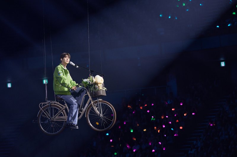 그룹 '엔시티(NCT)' 도영이 13~15일 서울 잠실실내체육관에서 펼친 '2025 도영 콘서트 [도어스]에서 솔로 정규 2집 '소어스'에 실린 '자전거'를 부르며 자전거를 탄 채 공중으로 솟아오를 때 "멈췄던 시간이 흘러가"는 마법이 빚어졌다.