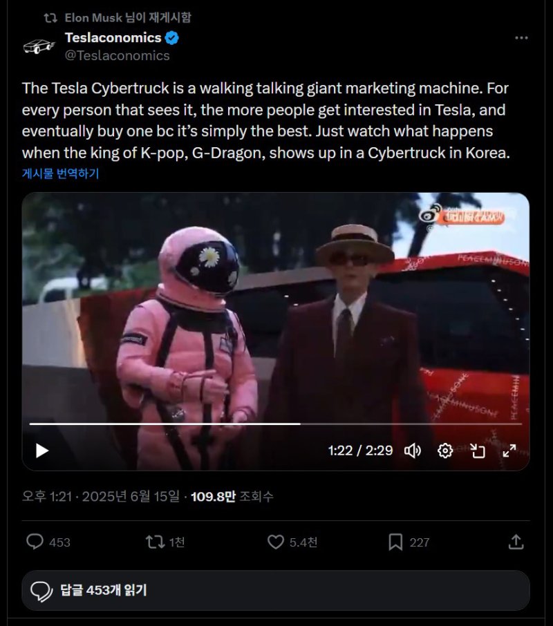 [서울=뉴시스]전재경 기자 = 일론 머스크 테슬라 최고경영자(CEO)가 가수 지드래곤이 테슬라 사이버트럭에 탄 영상을 리트윗했다.