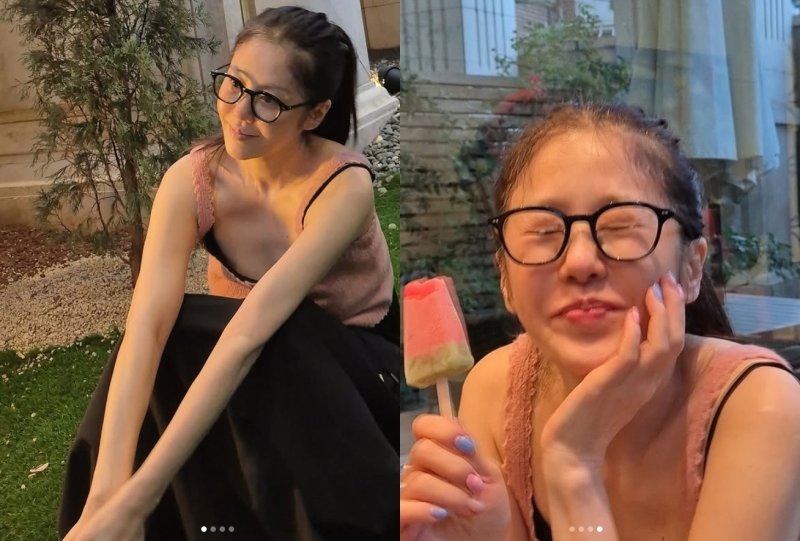 화장기 없는 얼굴에 뿔테 안경을 쓴 채 청초한 분위기를 더했다.
