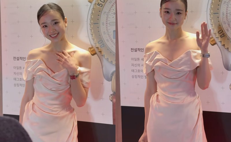 사진 속 손연재는 살구빛 오프숄더 드레스를 입고 청순한 매력을 뽐냈다. 스위스 시계 브랜드 태그호이어(TAG Heuer)의 핑크빛 시계로 세련된 분위기를 더했다.