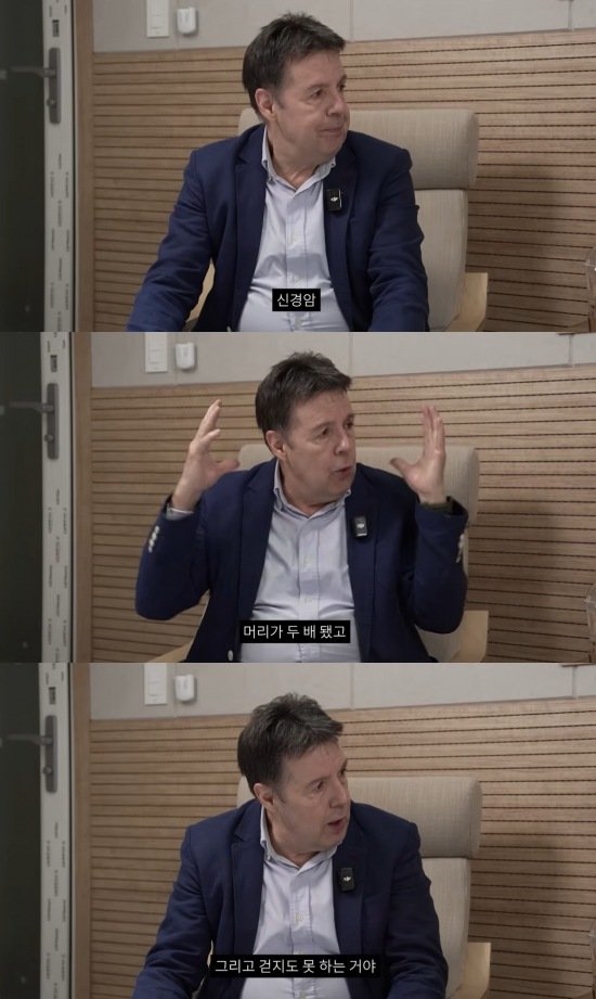 이어 "스테로이드 치료를 받으면서 몸이 다 부어서 머리가 두 배가 됐고, 배도 많이 나왔다. 그리고 걷지도 못했다. 왜냐하면 척추에도 염증이 생기고 온몸에 염증이 생겼다. 결국 휠체어를 타고 다닌 거다"라고 덧붙였다.