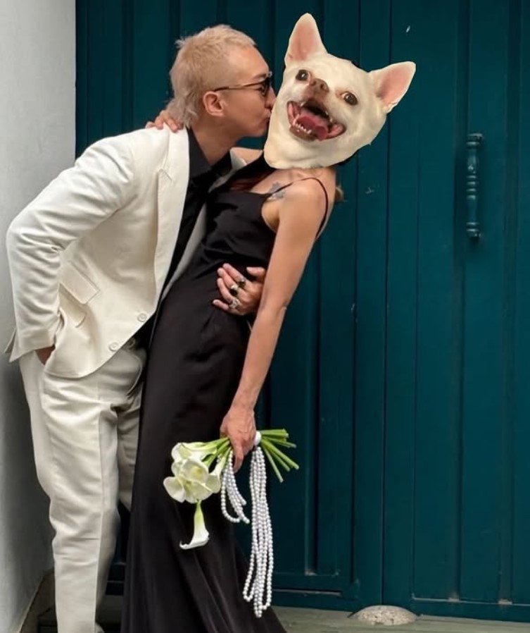 예비신부의 얼굴은 반려견 캐릭터로 가려졌지만, 다정한 분위기가 고스란히 전해졌다.