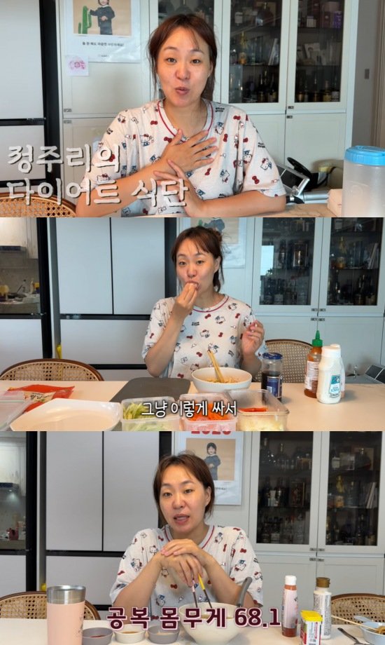 영상에서 정주리는 "뭘로 살을 뺐는지 궁금해하시는 것 같아 보여드리겠다"며 직접 식단을 소개했다.