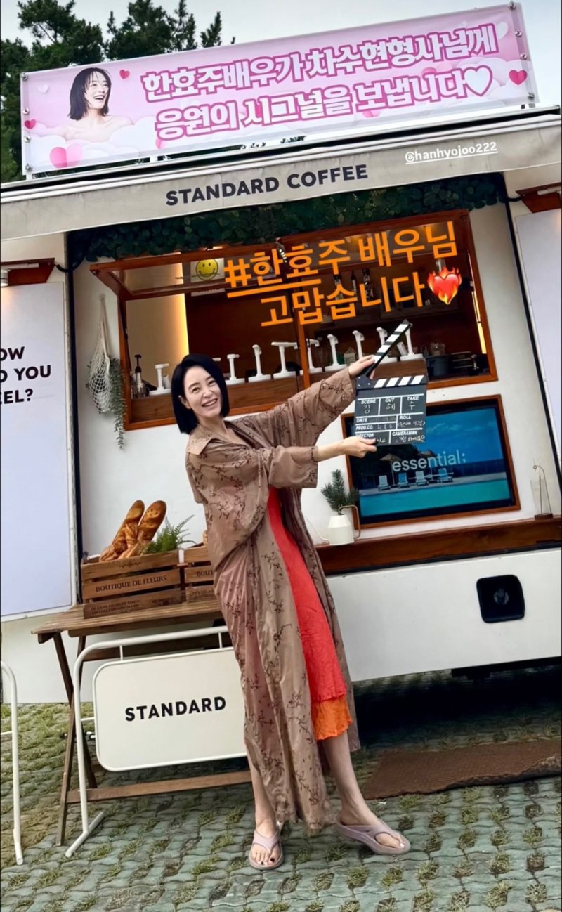 배우 한효주는 커피차를 보내며 "한효주 배우가 차수현 형사님께 응원의 시그널을 보냅니다"라는 글로 김혜수를 응원했다.