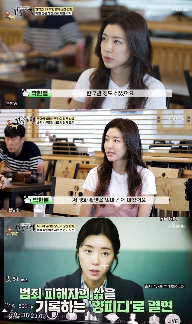 박한별은 10일 방송한 TV조선 '식객 허영만의 백반기행'에서 "한 7년 정도 쉬었다. 여덟 살, 네 살 아들 키우며 제주도에서 살았다"고 털어놨다. 만화가 허영만은 "아침에 나올 때 (아들이) 울지 않았느냐"고 물었고, 박한별은 "둘째는 누가 나가든 들어오든 상관이 없다. 사탕 주는 사람 있으면 다 따라가는 스타일"이라고 귀띔했다.
