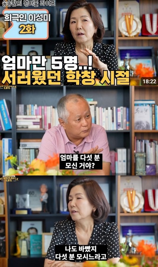 송승환이 "그러면 엄마를 다섯 분 모신 거냐"고 묻자 이성미는 "나도 바빴다, 다섯 분 모시느라고"라고 너스레를 떨었다.