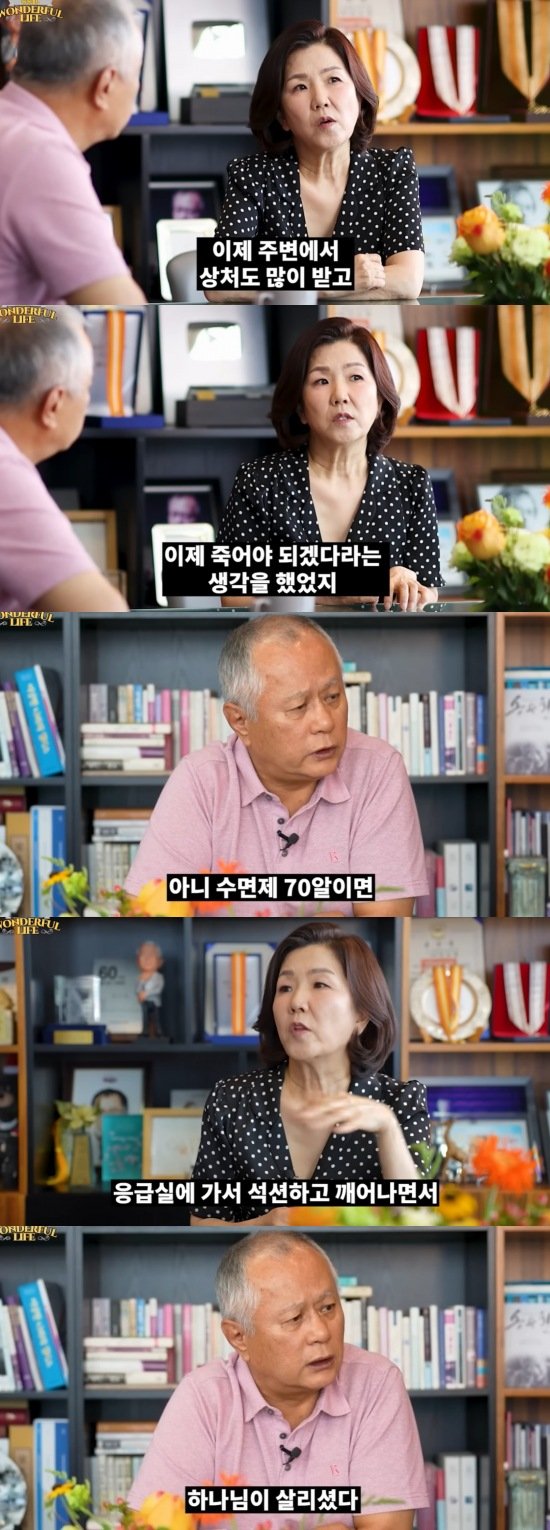 이어 "그래서 약을 먹고 술을 같이 먹으면 죽는다더라. 그때는 수면제를 살 수 있었으니까, 수면제 70알하고 술하고 같이 먹으면 죽는다 그래서 같이 먹었다. 근데 4시간 만에 깨어났고, 응급실로 실려가 석션하고 깨어나면서 인생이 나동그라졌다"고 고백했다. 이야기를 듣던 송승환은 "수면제 70알이면 그건 정말 치명적인데"라며 "하느님이 살리셨다"고 말했다.
