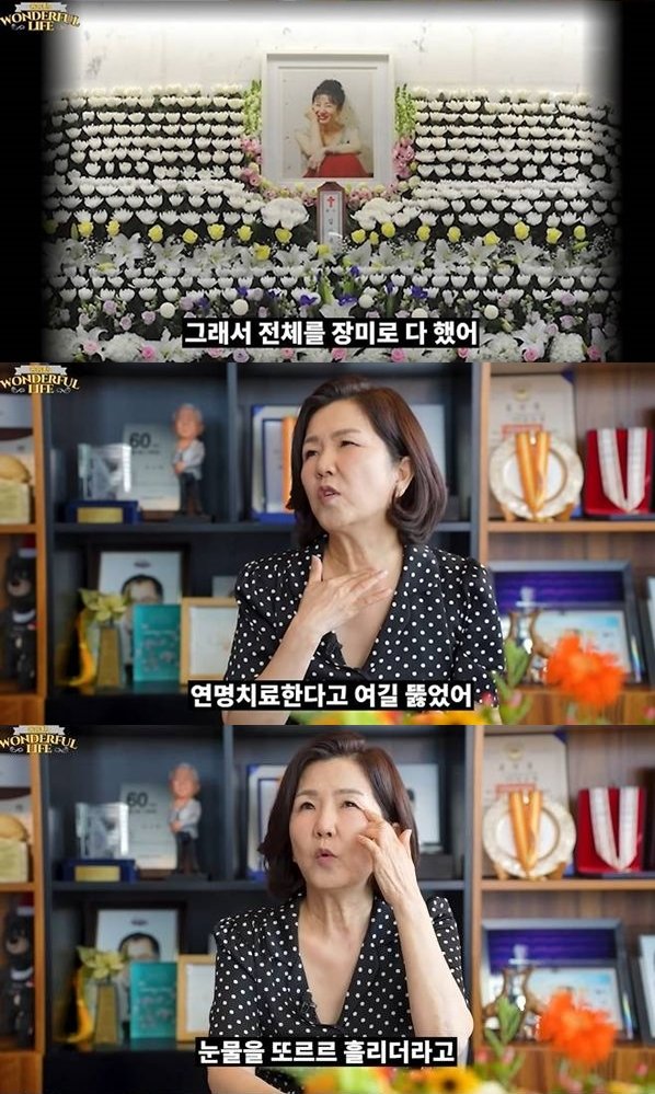 "어느 날 언니 문제를 보는데 횡설수설하고 좀 이상하더라. 알고 보니 병원에 가야 하는 상황이었다. 언니가 연명치료를 한다고 목에 구멍을 뚫었다. 언니 손을 잡으니까 눈물을 흘리더라. 그게 마지막이다. '나 죽으면 네가 상을 치러줬으면 좋겠어' '박술녀 선생님 한복 입혀줘. 국화 싫으니까 장미로 해줘'라고 하더라. 내가 '별나기도 더럽게 별나다. 아무 꽃이나 놓으면 되지'라고 하니 '싫어. 나 장미 놔줘'라고 하더라. (장례식에서) 전체를 장미로 했다.